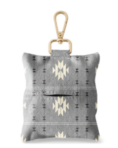 All over printed cotton canvas with metal clip and zip opening for easy refill.4 high x 3.5 wide, not including clip. 5 wide x 8 high peggable backercard packaging. Not gift boxed. Includes 2 rolls of plastic waste bags,30 bags total. Holds 2 rolls of standard waste bags for future refill.Featuring artist collaborated design where noted. Not gift boxed.Minimum order 3 per design.$8.00 each