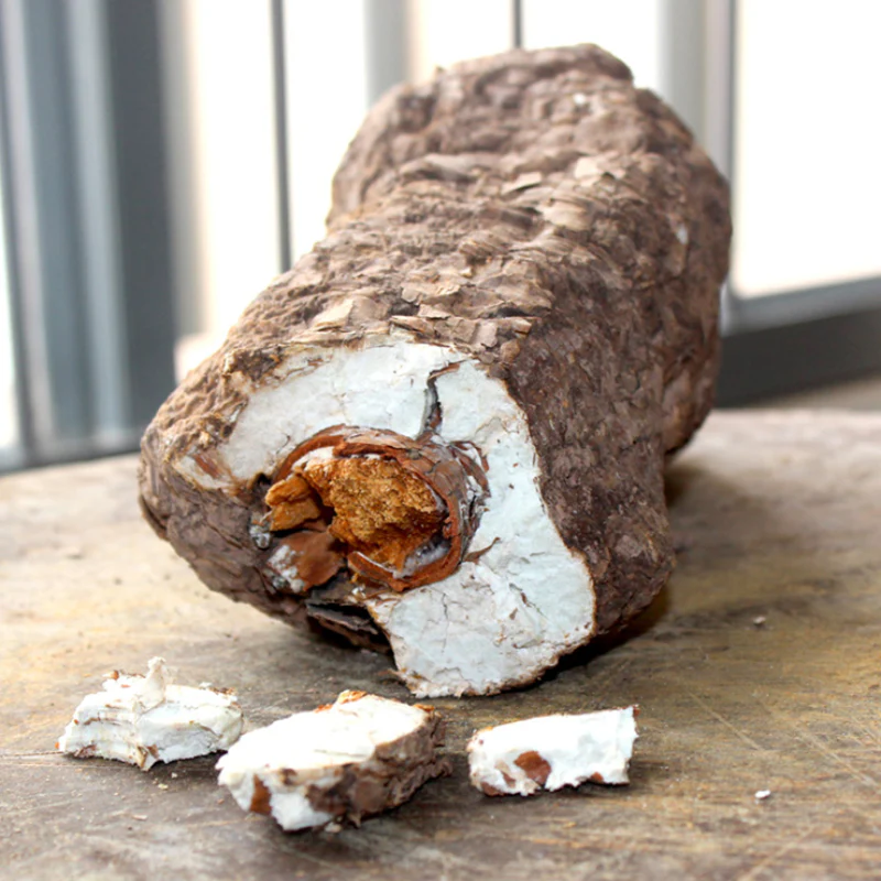 The Poria mushroom (Wolfiporia extensa), known as “Fuling” in Chinese, is an edible medicinal mushroom belonging to dry sclerotium of polyporaceae fungi. It has more than 2000 years of medical application history for its remarkable pharmaceutical effects. It's one of the most commonly prescribed traditional remedies in traditionnal chinees medicine, being frequently used to treat inflammation, a variety of gastric ailments, dizziness, edema, and nausea.