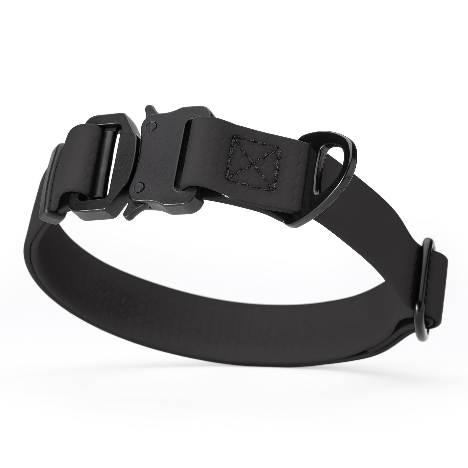 This dog collar with metal buckle is made from HEX - a PVC coated webbing with honeycomb pattern that is completely water- and odor resistant, soft to touch and does not stretch. No more worries about smelly and dirty collar – let your four-legged friend jump through puddles, run on the beach, play in the snow or rain and enjoy their walks in any weather and environment!